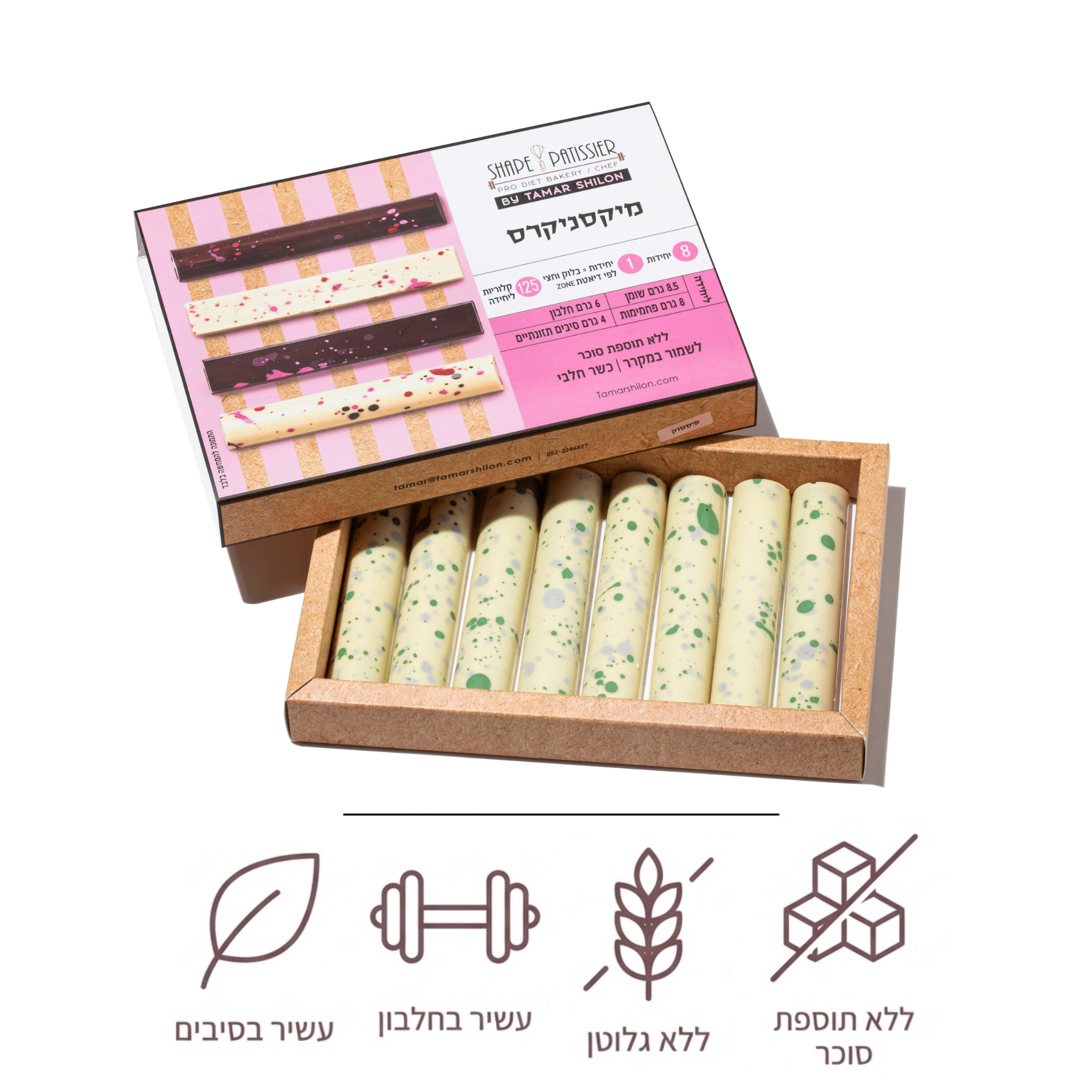 מארז של 4 או 8 יחידות של חטיף חלבון משוקולד לבן ללא תוספת סוכר, במילוי גנאש פיסטוק עשיר, קריספי פטל וטחינת חלבון פיסטוק עם נגיעות לימון.