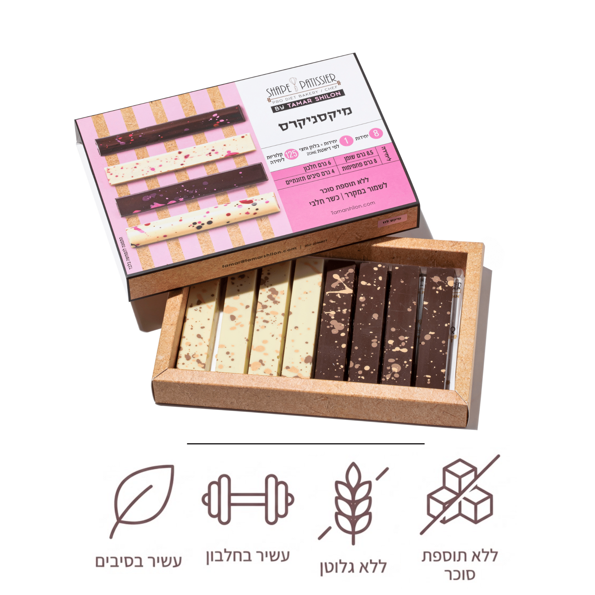 8 יחידות של חטיף חלבון שוקולד לבן ושוקולד מרירממולא בחלבון וגנאש אגוזי לוז ללא סוכר, מועשר בסיבים תזונתיים.