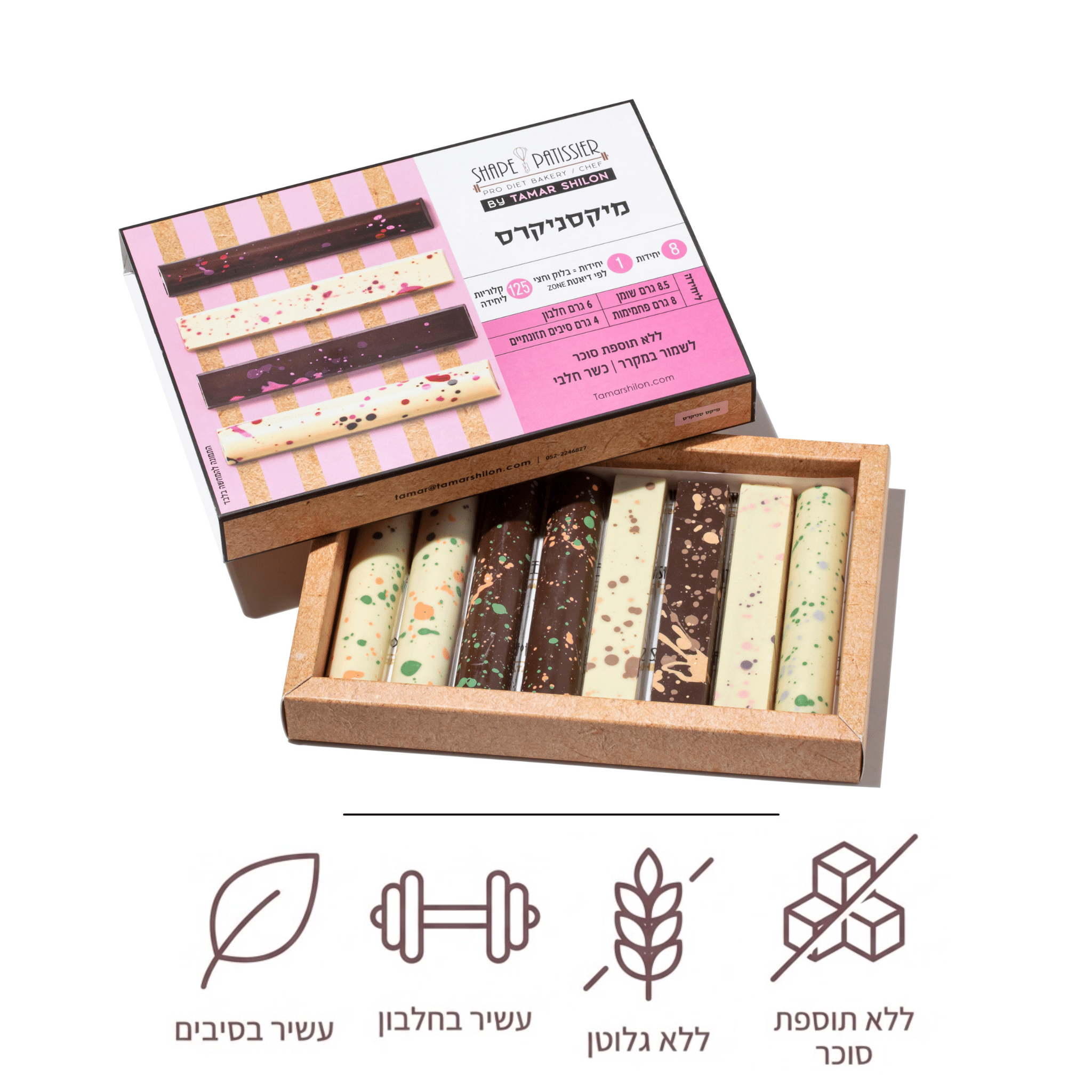 מיוצר בישראל / ללא תוספת סוכר / ללא גלוטן / מעושר בסיבים / כשר